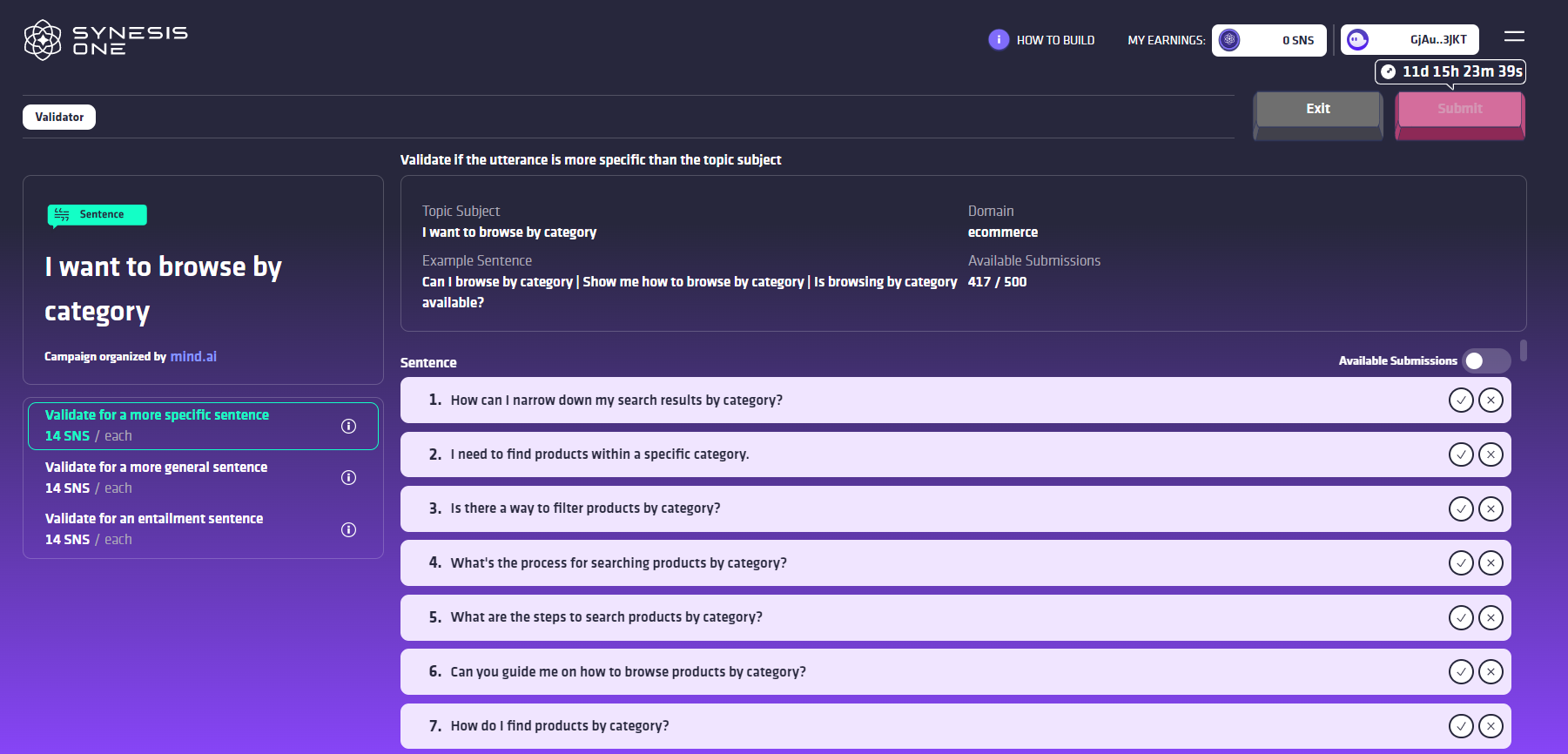 캠페인을 선택하고 100 SNS를 연결합니다. 캠페인 화면에 빌더가 제출한 사용 가능한 발화 목록이 표시됩니다. 발화가 'full'로 표시되어 있으면 다른 검증자가 이미 유효성을 확인했음을 의미합니다. 사용 가능한 각 제출을 주의 깊게 읽어 보십시오. 아래의 검수자 가이드라인에 자세히 나와 있는 내용을 적용한 다음 승인할 체크마크 또는 거부할 X를 선택하십시오. 만약 당신이 발화를 거부하면, 드롭다운 메뉴에서 이유(관계성, 관련성, 패턴 다양성, 또는 자연스러움)를 선택하도록 안내할 것입니다.
